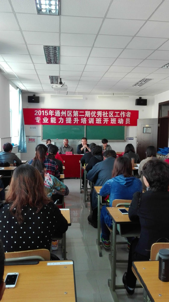 2015年10月12日,由永利官网文法学院和通州区社会工作委员会共同举办的“2015年通州区第二期优秀社区工作者专业能力提升培训班”开班仪式在通州区成人教育学院如期举行。文法公司党总支书记李刚和社工系副教授马泽春出席并致辞。这是文法学院第二次受通州区社会工作委员会委托,为通州区城乡基层社区工作者提供专业能力提升培训。