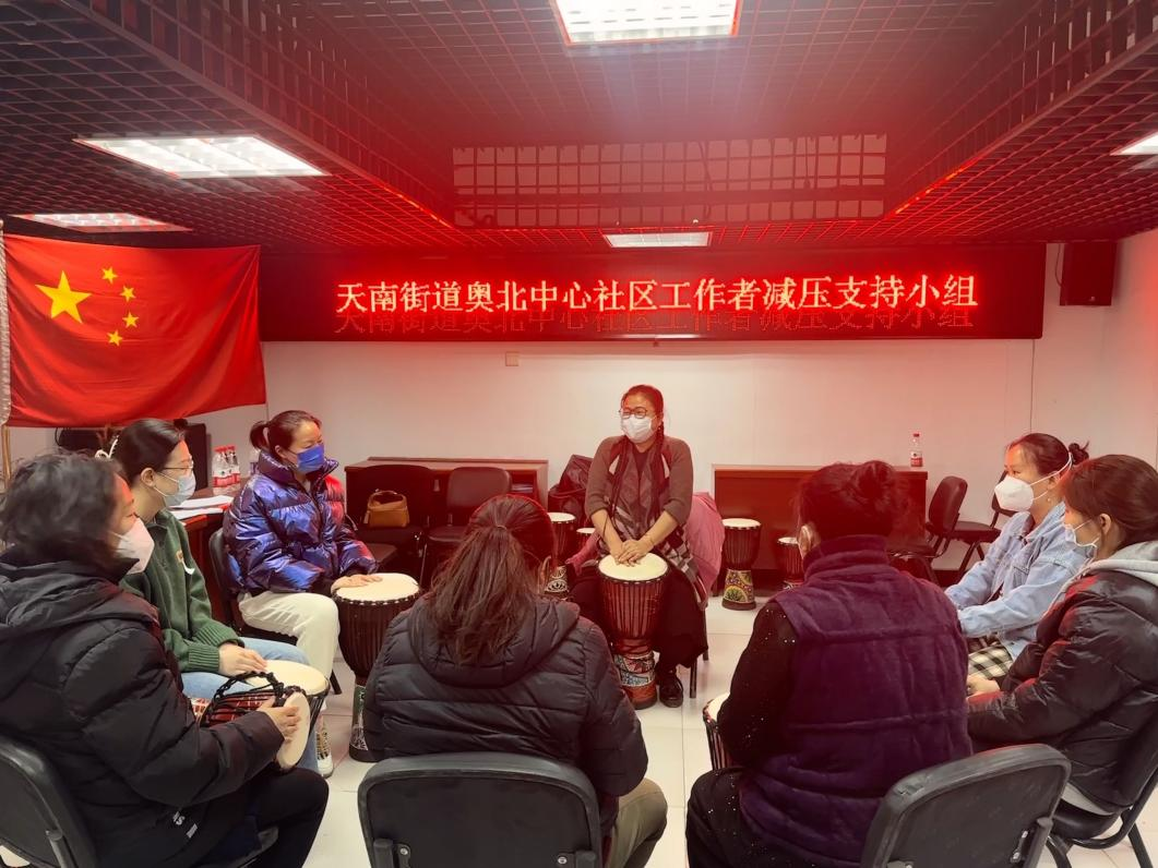 本次的“鼓圈--音乐治疗”小组活动让大家释放了积压的压力,欢快跳脱的气氛让组员们从工作的压力中解放出来。同时还学习了腹式呼吸法,引导工作者们静下心来真正地感受自己的内心,在温馨和睦的氛围中,此次奥北中心社区工作者减压小组圆满结束。